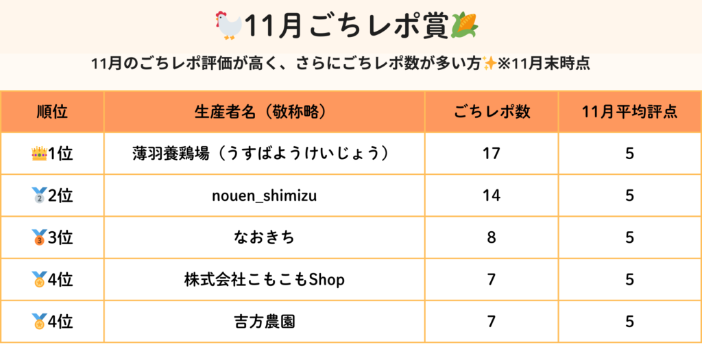 産直アウルでは、毎月「ごちレポ賞」として、レビュー評価の高い生産者さんをピックアップしています。