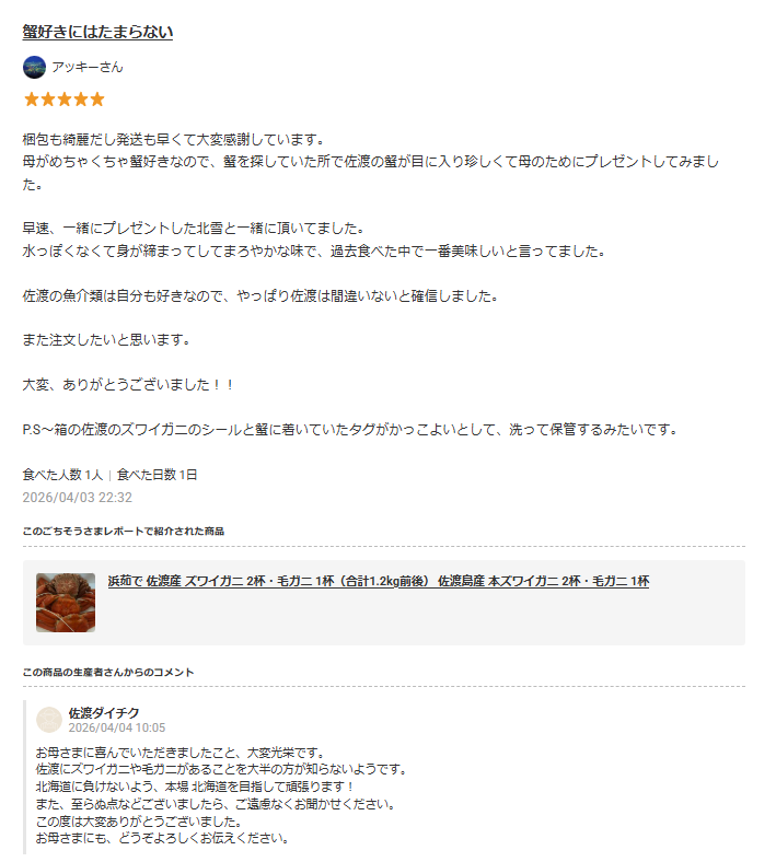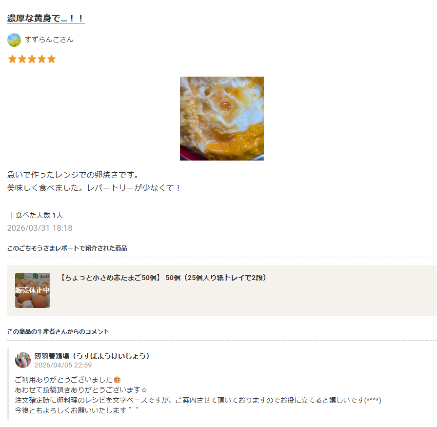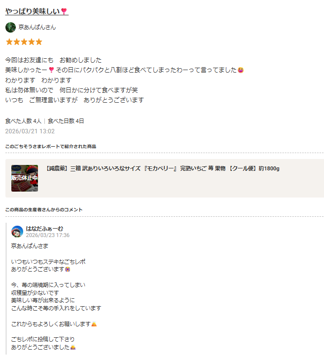 - ごちレポへの返信がとても丁寧で、購入者とのコミュニケーションを大切にされており、リピーターづくりにもつながっています。
