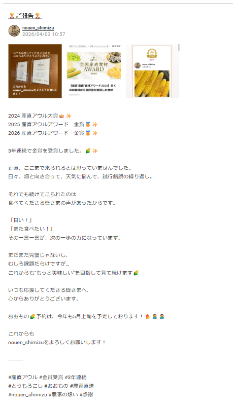これからも皆さまの活動が、さらに多くのファンを生み、産直アウル全体を盛り上げていくことを楽しみにしています。