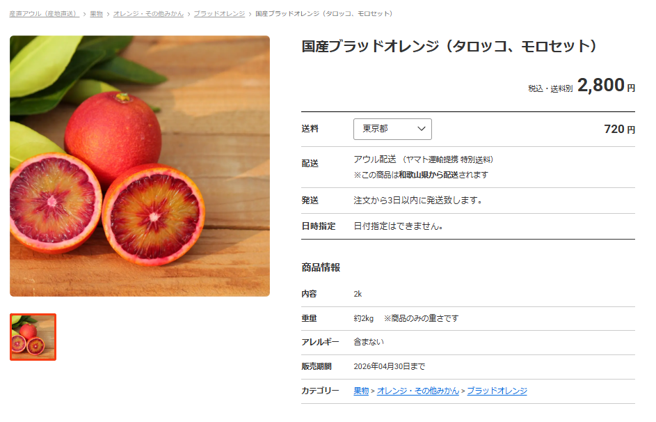 - 商品名が「国産レモン2k(お試し用)」「国産ブラッドオレンジ(タロッコ、モロセット)」などシンプルでわかりやすく検索にヒットしやすい形式にされています。